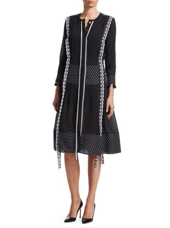 This chiffon dress offers billowy effects in the form of its printed skirt. Framed with eyelet embroidery, this piece is the epitome of bohemian elegance.