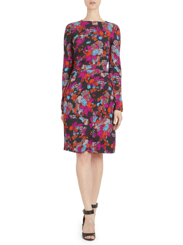 This botanical creation flaunts colorful vintage-inspired florals and a faux wrap skirt. Cinched at the waist, this svelte dress is a flattering essential.