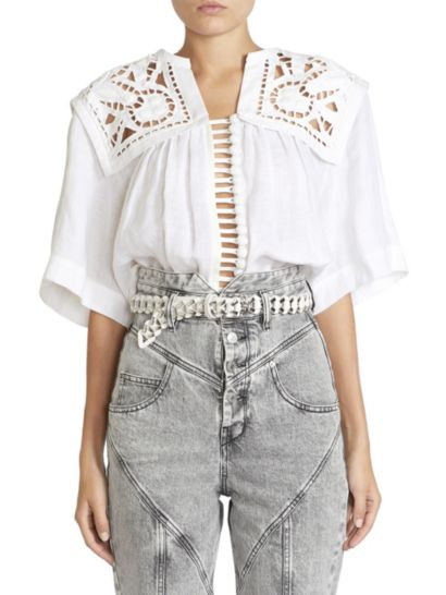 This eyelet lace creation flaunts a fluid silhouette that embodies a bohemian sensibility. Delicate by design, yet minimal in visuals, this top embodies whimsy.