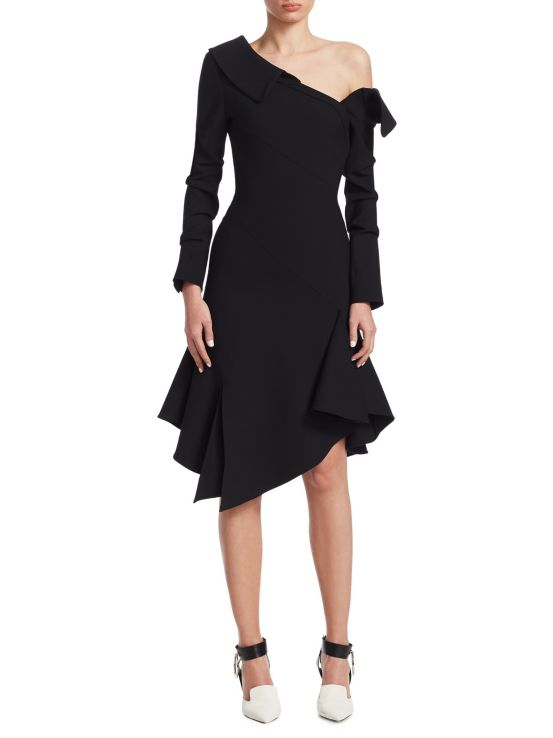This svelte feminine creation receives an abstract update with its asymmetrically ruffled hem. Featuring ruched sleeves and an off-the-shoulder sleeve, this classic dress receives a bold update.