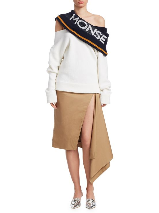 This luscious wool sweater features a bold logo shawl that accentuates colorblock accents on this piece. Contemporary in design and luxurious in craftsmanship, it is an updated wardrobe classic.