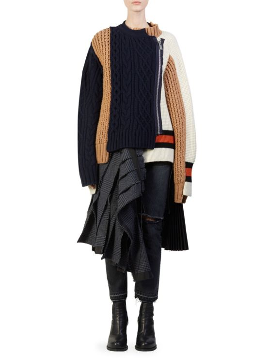 This abstract creation merges contemporary edge with timeless elegance. Colorblock in design and featuring a zip front, this is a truly amalgamated piece.