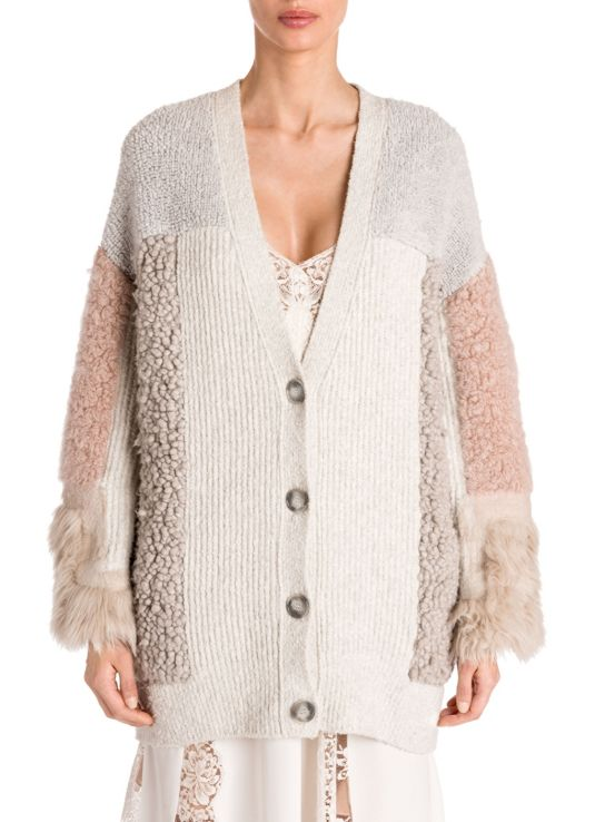 This luscious cardigan is formulated with versatile textures. Rib-knit, marled, and fuzzy, these patches elevate this piece to vintage abstractness.